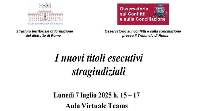 “Titoli esecutivi stragiudiziali”. Sarà questo il tema della 2a Officina della Conciliazione 2025, organizzata dall’Osservatorio sui Conflitti e sulla Conciliazione in collaborazione con la Formazione Decentrata dalla Scuola Superiore della Magistratura. L’evento si terrà lunedì 7 luglio 2025 tramite la piattaforma Teams dalle 15 alle 17.
