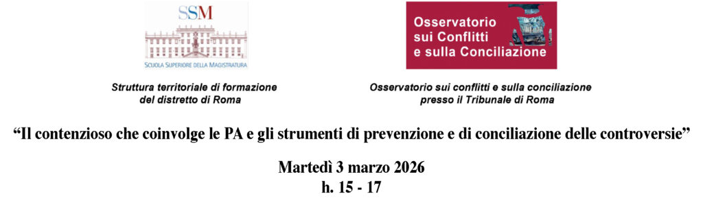 Si terrà in data martedì 3 marzo 2026 la 1a Officina della Conciliazione di quest’anno, come di consueto organizzata in collaborazione tra l’Osservatorio sui Conflitti e sulla Conciliazione e la Formazione Decentrata della Scuola Superiore della Magistratura.