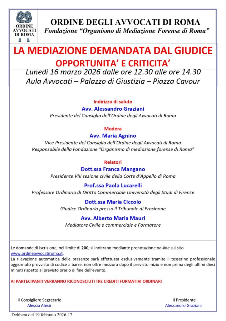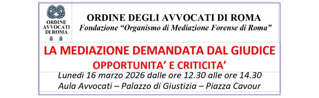 Si terrà lunedì 16 marzo 2026, dalle ore 12:30 alle ore 14:30, presso l’aula avvocati del Palazzo di Giustizia, in piazza Cavour, il corso “La mediazione demandata dal giudice: opportunità e criticità”, organizzato dall’Ordine degli Avvocati di Roma – Fondazione “Organismo di Mediazione Forense di Roma”.